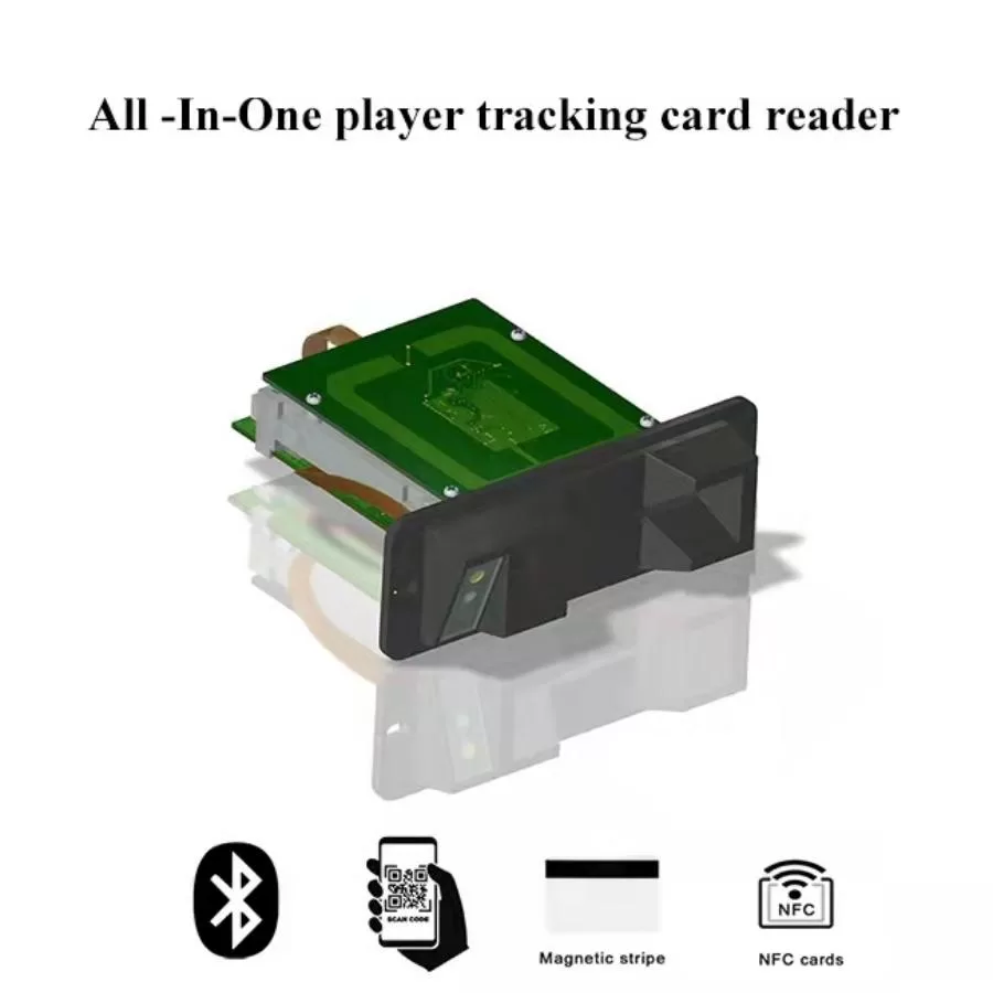 All -in-one player tracking card reader is the most advanced player card reader ever developed. It comes with QR code and Bluetooth capability as well as reading the player ID from the dual track magnetic stripe or from an embedded RFID chip. It turns every cell phone into a player card! This allows casinos to communicate with customers in real time. The built in QR code scanner identifies the player while the Bluetooth enables the slot machine to communicate with their cell phone to know when the player starts and stops playing. In addition to utilizing the universal use of cell phones it opens up a new world of being able to market to players in real time with bonus plays, player preferences, and unlimited casino offers that will boost player loyalty .This is all done while still retaining the capacity to accept mag stripe and RFID.